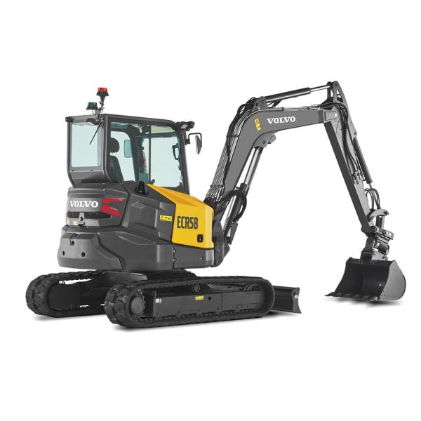 Volvo ECR58 är en smidig minigrävare med en vikt på cirka 5 800 kg och kort svängradie, vilket gör den enkel att använda även i trånga utrymmen. Den drivs av en dieselmotor på 35,5 kW och kan nå ett grävdjup på upp till cirka 3,9 meter. Maskinen har ett bränslesnålt hydraulsystem, ECO-läge och automatisk tomgång som minskar både bränsleförbrukning och slitage. Ljudnivån är 74 dB(A) inne i hytten och 97 dB(A) utanför. Skoporna finns i flera storlekar med bredder från 30 till 90 cm.