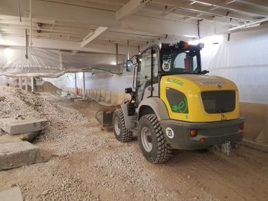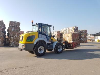 Fyrhjulsstyrd hjullastare med eldrift. Tillbehör: planerskopa och pallgafflar