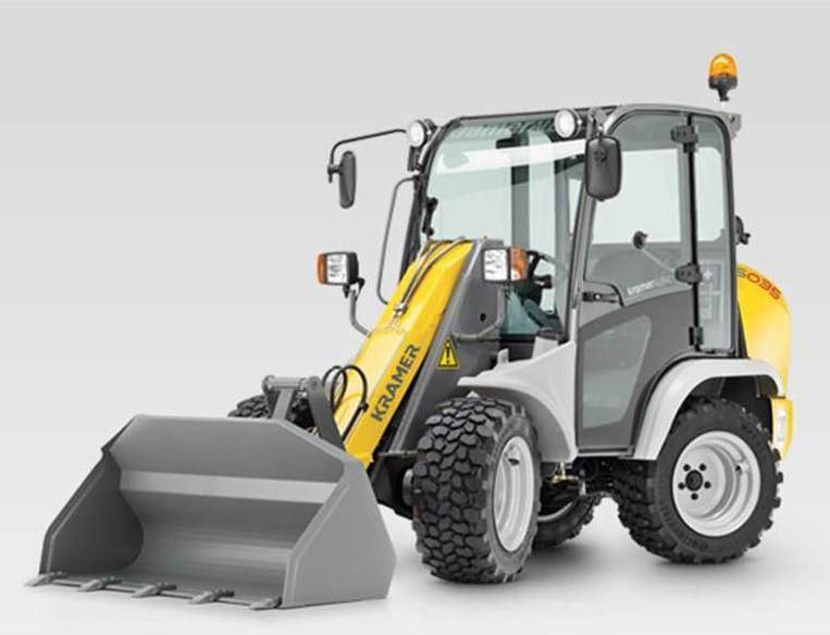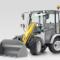 Fyrhjulsstyrd hjullastare. Tillbehör: planerskopa och pallgafflar