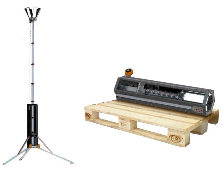Baselight 320X: Portabel flexibel och robust mast för inom- och utomhusbruk med en ljusstyrka på upp till 45 000 lumen. De effektiva LEDarna ger ett otroligt bra ljus som är dimbart. Masten, teleskopisk, fälls upp och tas ned på under en minut. Det gör den väldigt flexibel på arbetsplatsen. Du får ljus där du behöver det. Fullt uppfälld är den 4,4 meter hög. Armaturen kan tiltas i olika riktningar vilket gör den perfekt för tak- golvarbete, tunnel samt underhållsarbe. Ihopfälld tar den liten plats och ryms i bagageutrymmet på en personbil. Vikt: 33kg, IPklass 65, Höjd 4,4m, ihopfälld 1,2m, max vindstyrka: 20m/s. Går enkelt att förankra om så behövs. Voltage: 110V-230VAC 50/60Hz
