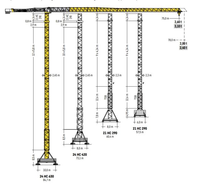 Liebherr 340 EC-B 12 är en av tillverkarens senaste modeller, som direkt blivit en favorit hos kunderna. Det är en kran som lyfter upp till 12 ton och den kan monteras med en räckvidd på 78m. Hur hög en kran skall vara bestäms naturligtvis av hur högt projektet är, men även av omkringliggande hinder som skorstenar och andra byggkranar etc. som man behöver ta hänsyn till. Här går det att konfigurera med olika uppställningsmöjligheter, så kontakta oss så hjälper vi er att hitta rätt lösning för er arbetsplats!