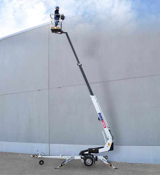 DINO 120 TB är en lätt och stabil släpvagnsmonterad teleskoplift, konstruerad för arbete både inomhus och utomhus. Liften erbjuder en maximal arbetshöjd på 12,0 meter, en plattformshöjd på 10,0 meter samt en horisontell räckvidd på 7,9 meter. Bommen har obegränsad rotation, vilket gör det enkelt att positionera liften från olika riktningar utan att behöva flytta hela enheten.