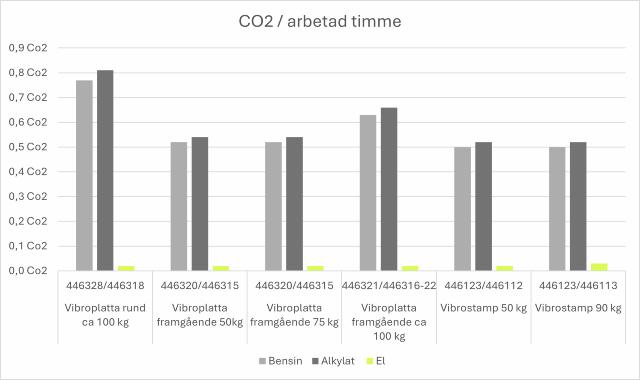 Genom att hyra batteridrivna vibroplattor och stampar kan projekt sänka sina koldioxidutsläpp i drift med 94 – 97% i jämförelse med motsvarande maskin. Driftkostnaden för maskinerna är också lägre då kostnaden för bränsle överstigen kostnaden för att ladda upp batteriet. Graf 1 nedan visar koldioxidutsläpp per arbetad timme för några av de modeller vi har i vår hyrespark.